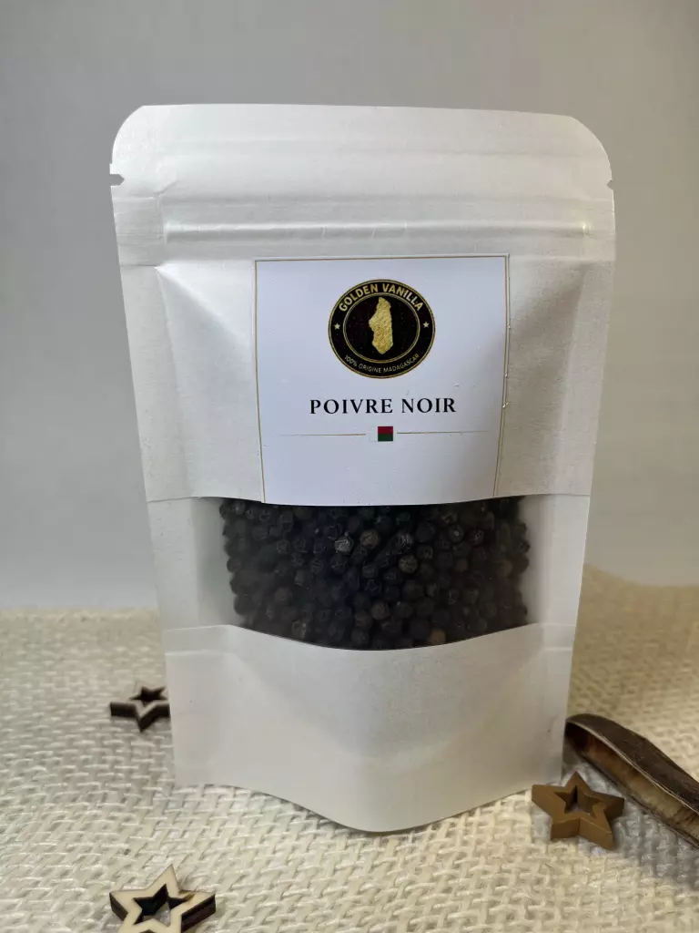 Poivre noir en grains origine Madagascar, sélectionné pour sa belle taille et son arôme puissant. Goût riche et profond, parfait pour grillades, marinades et plats mijotés.