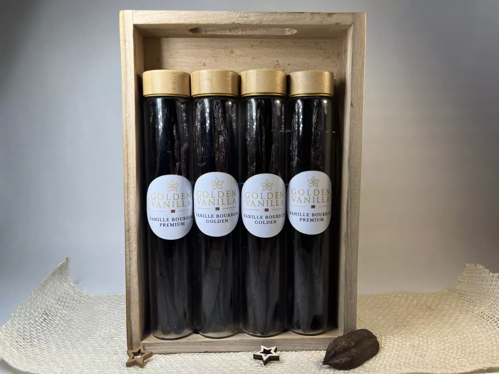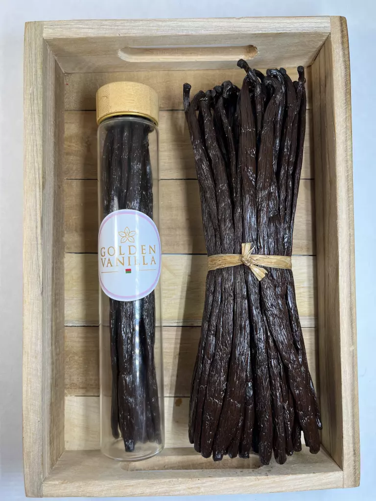 La Vanille Bourbon Golden Vanilla est le joyau de notre collection. Issue des plus belles plantations malgaches, elle se distingue par ses gousses longues, épaisses et parfaitement maturées, sélectionnées une à une selon des critères stricts de qualité.